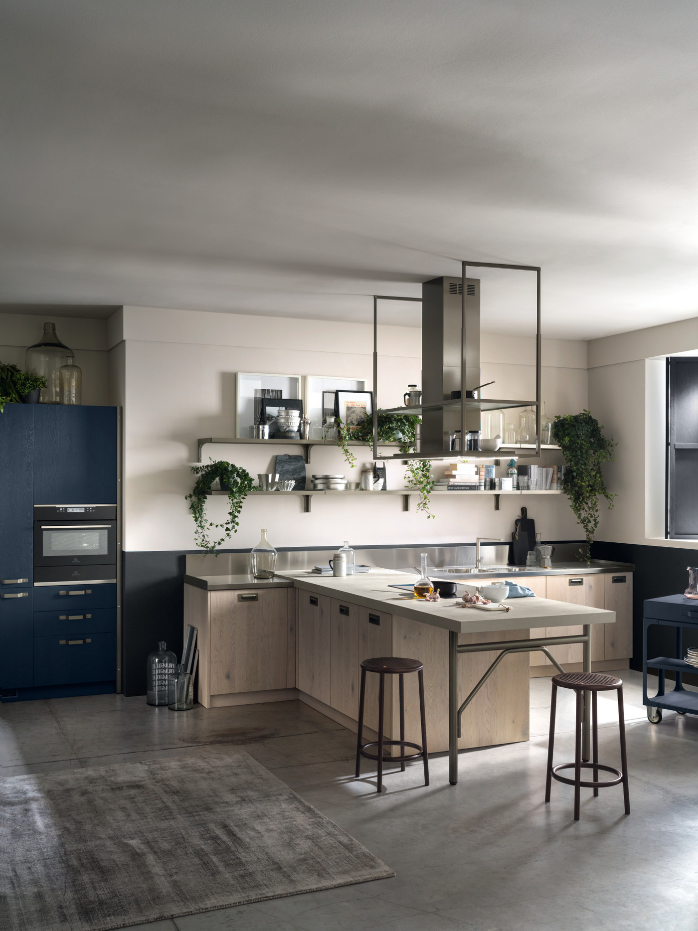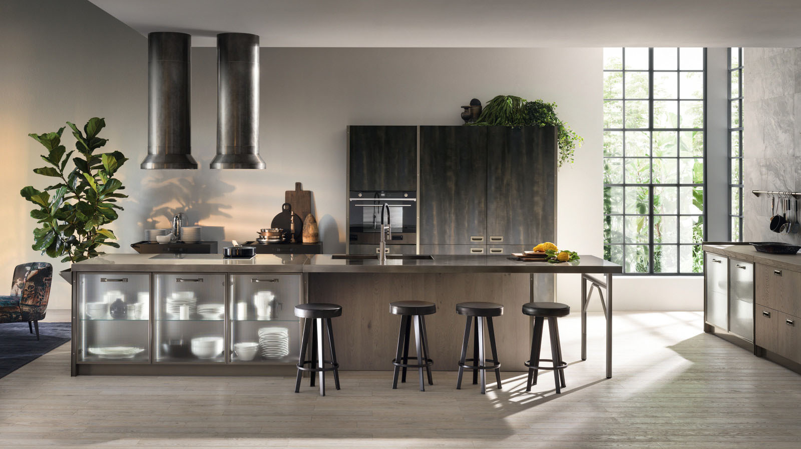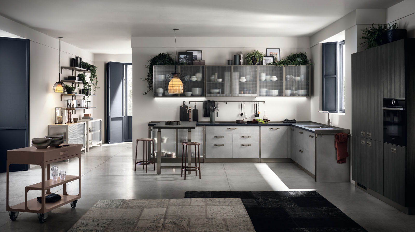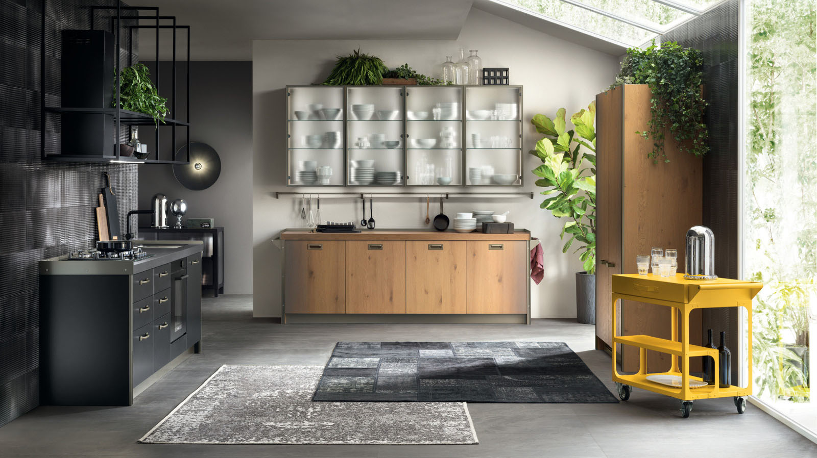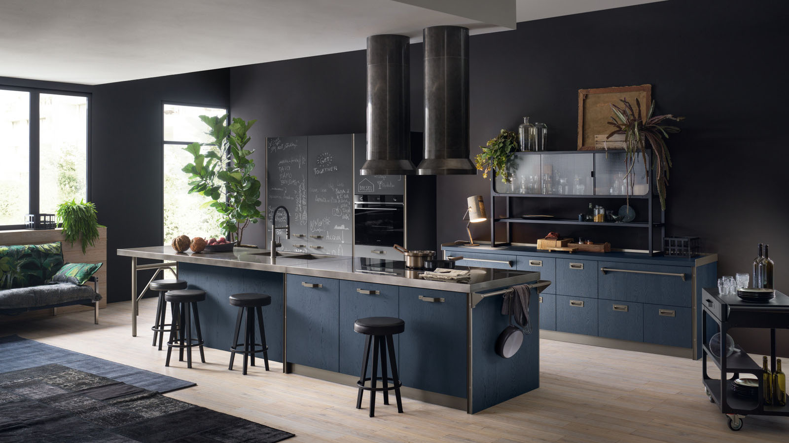Эта коллекция, ставшая результатом сотрудничества компании Scavolini с брендом Diesel Living, представляет собой стилистическую эволюцию бестселлера Diesel Social Kitchen. Теперь кухня преимущественно является местом для общения и наслаждения домашним комфортом. Концепция кухни основывается на блоках цветов и материалов, которые соединяют кухню с гостиной. Универсальная мебельная система обладает высокой степенью персонализации благодаря богатой гамме цветов и текстур высокой эстетической ценности. Створки с рамой из алюминия, окрашенного в цвет Титан, и литого стекла Soft Industrial Glass, а также полки обладают самобытным характером. Три уникальных вида ручек, врезная и две ручки-скобы с отделкой Титан, и многочисленные элементы в духе индустриального стиля, металлические детали и винты, подчеркивают смелый дизайн Diesel Get Together. Новые рабочие поверхности в свою очередь позволяют создавать многочисленные варианты сочетаний материалов. Элементы Misfits из окрашенного металла (Chest, Bridge и Cart) представляют собой ключевые стилистические коды, способные стереть границы между пространством кухни и гостиной.