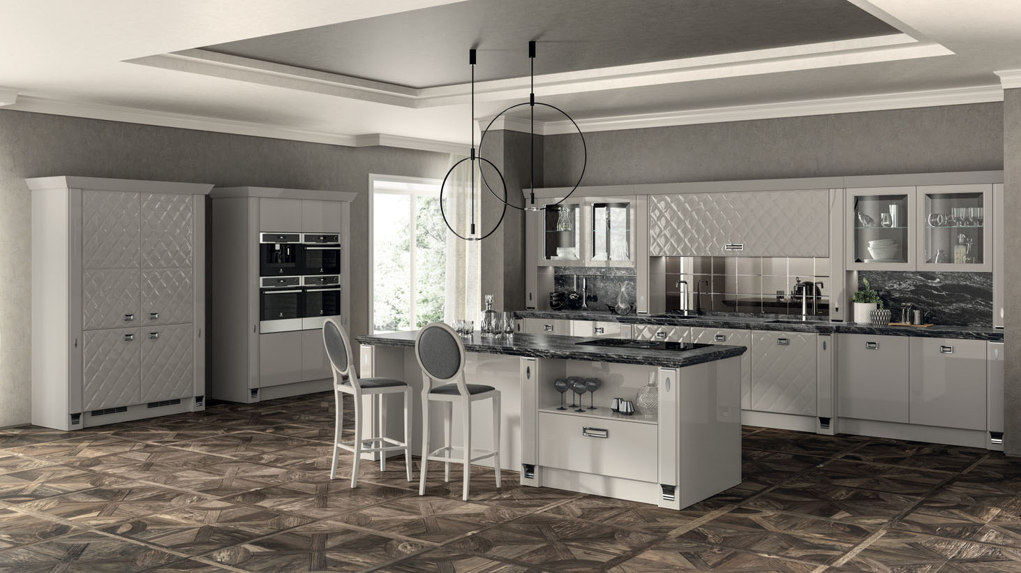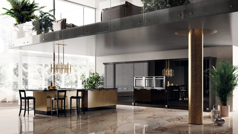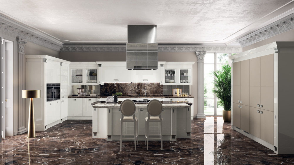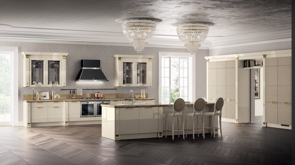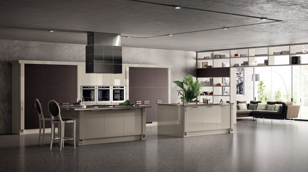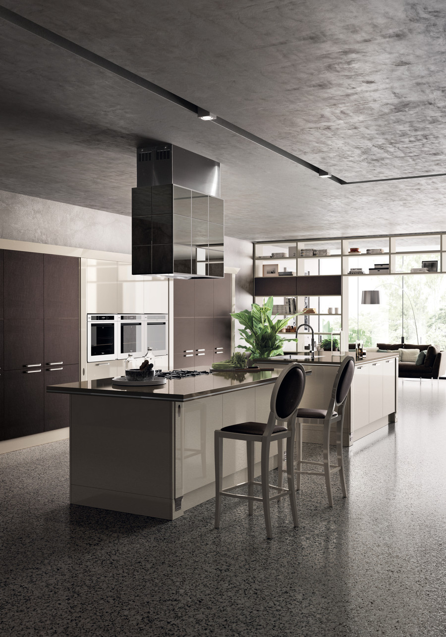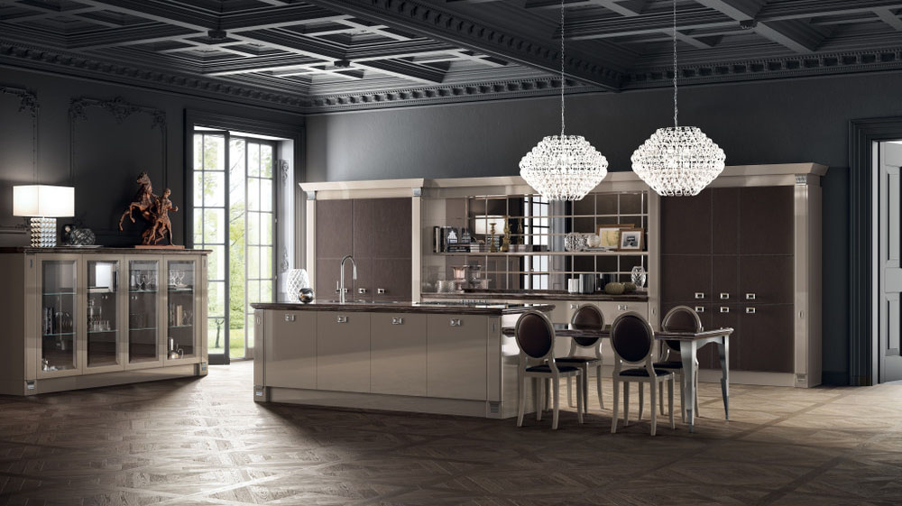 Exclusiva, дизайн Vuesse, - это предложение высокого класса: ремесленные детали в духе классического стиля органично вписаны в проект кухни, предназначенный для требовательного международного рынка роскоши. Ценность материалов - одна из особенностей этой кухни: сочетание лакированной глянцевой отделки цвета Норковый мех с кожей цвета Эбеновое дерево, используемой для декорирования модульных шкафов, делает эту композицию еще более изысканной.