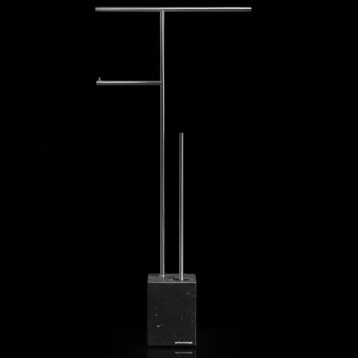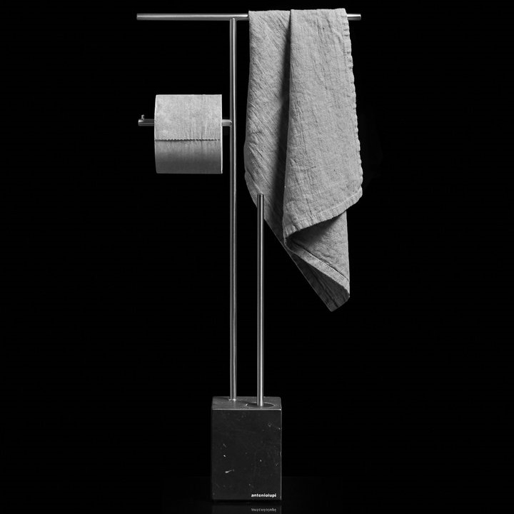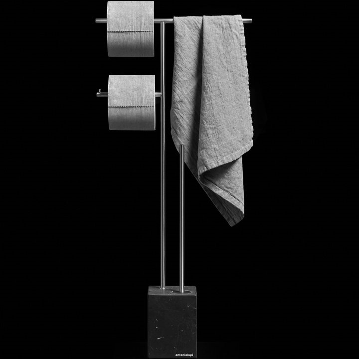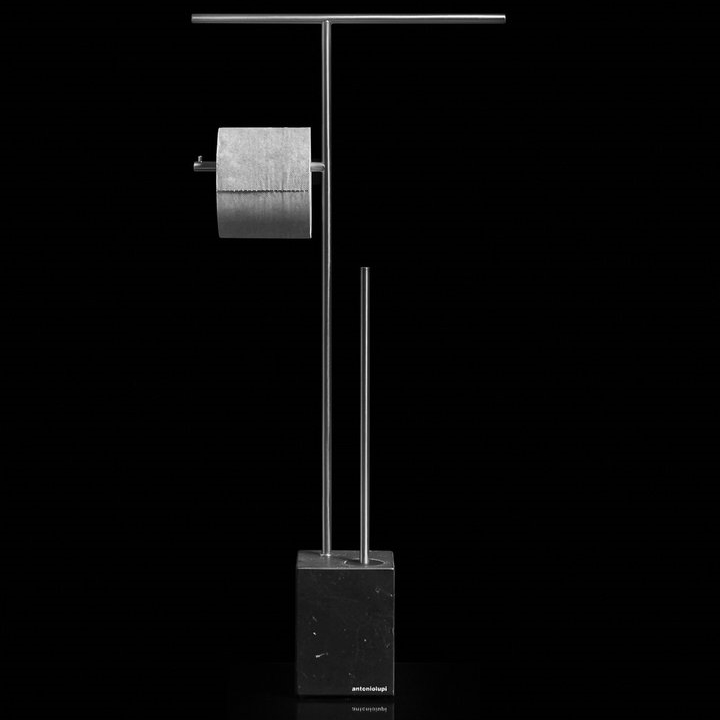 Стойка напольная, 31.5*10*68h, с ершом, полотенцедержателем и держателем туалетной бумаги, база NERO MARQUINIA/сталь матовая. Стойка комбинированная Antonio Lupi BIVIOCOMBI от AL Studio представляет собой гармоничное сочетание функциональности и современного дизайна. Это напольная стойка, в которой каждый элемент обдуман до мелочей: от ерша до полотенцедержателя и держателя туалетной бумаги. Сочетание камня и металла придает стойке особый характер. Камень обеспечивает неповторимую текстуру и эстетику, в то время как металлические детали добавляют современный акцент и гарантируют долговечность конструкции.