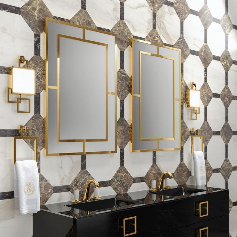 Сделать образ ванной комнаты в стиле ар-деко завершенным помогут бра из коллекции Vichy. Геометрическая скульптурная композиция из глянцевого металла обрамляет плафон из матового муранского стекла. Серия Vichy прекрасно сочетается со всей мебелью бренда Oasis.