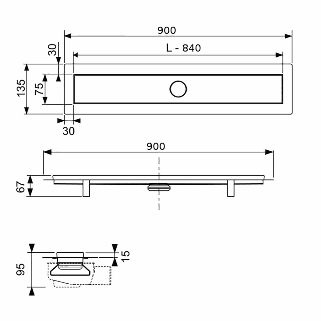 Комплект для монтажа дренажного канала 2 в 1 с основой для плитки “tile” и “steel”, с мембраной 90 см., 90*13,5*h6,7