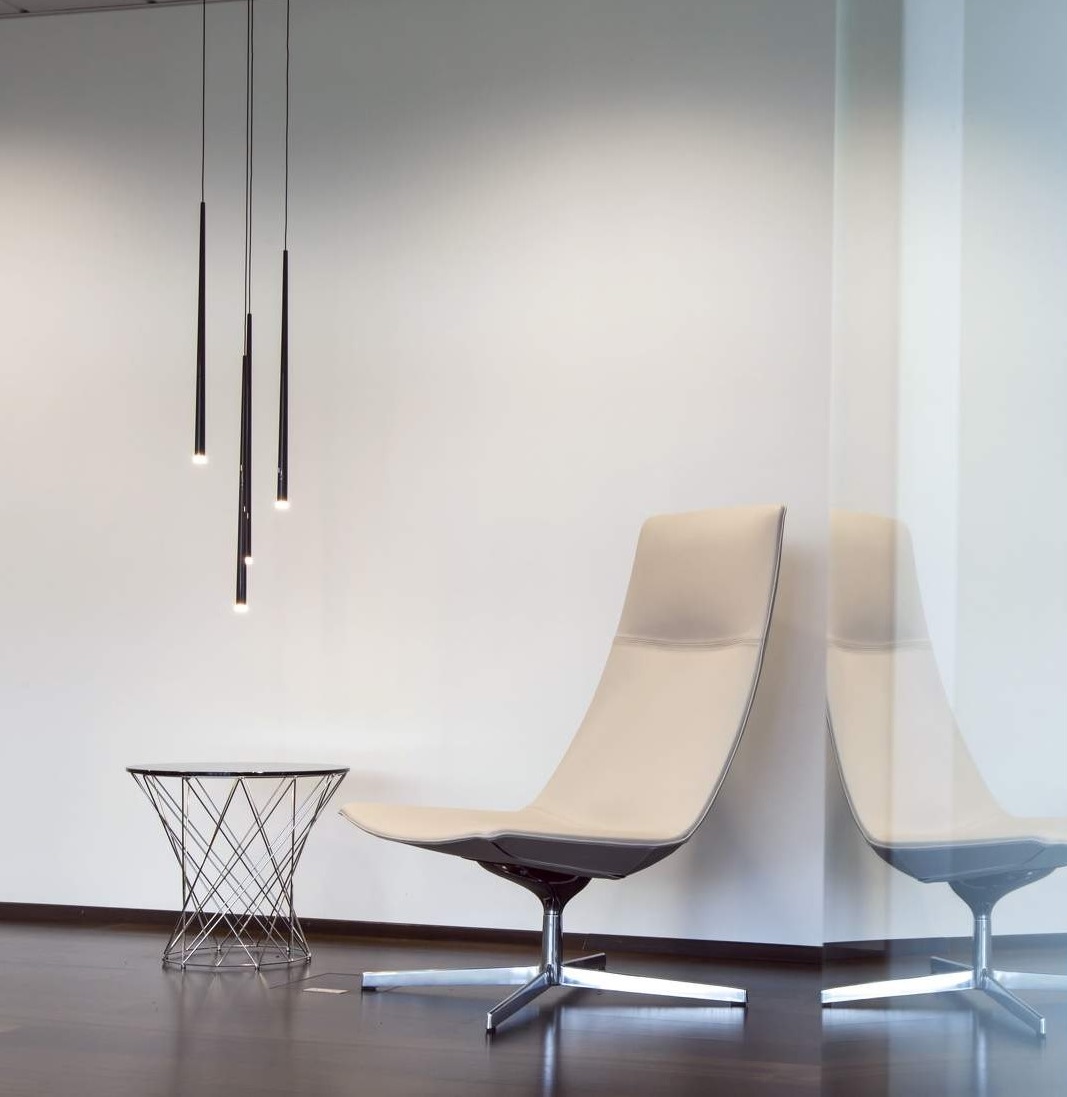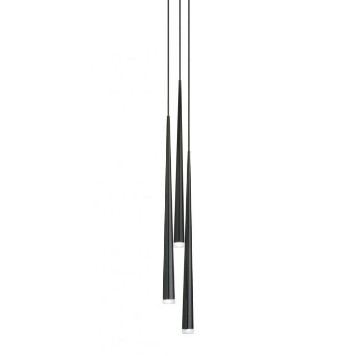 Потолочный светильник Slim с тонкими изящными лампами создает приятное акцентное освещение. Четыре светодиодных конуса на длинных подвесах отделаны черным карбоновым волокном с индустриальной фактурой.