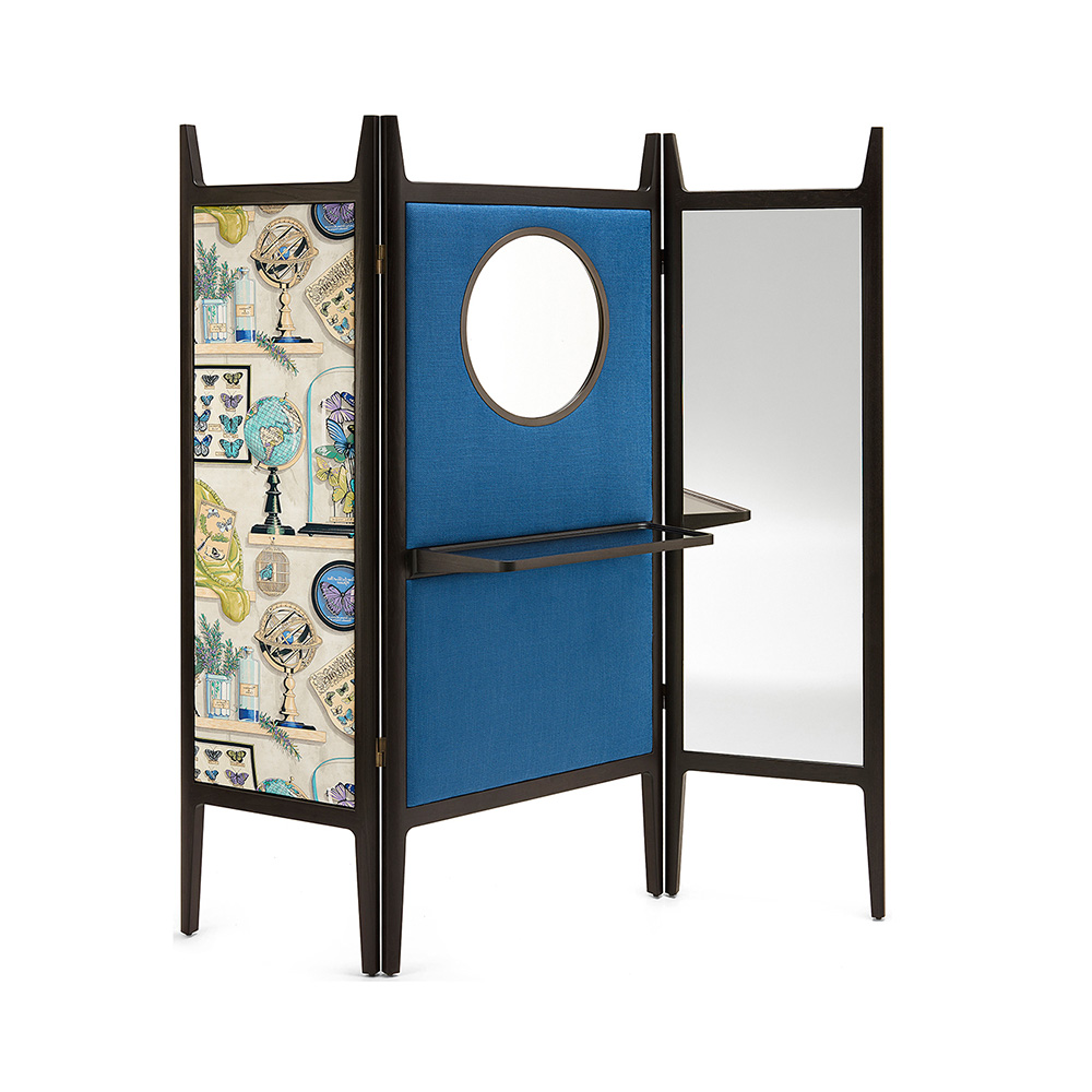 Ширма CECCOTTI Set, разработанная дизайнером Giuseppe Casarosa, представляет собой сочетание функциональности и эстетики. В её оформлении используются контрастные цвета: насыщенный синий и глубокий коричневый, что делает её выразительной и запоминающейся. Эта ширма идеально вписывается как в классические, так и в современные интерьеры, служа не только разделителем пространства, но и акцентирующим элементом декора. Сине-коричневая цветовая гамма гармонирует с различными оттенками и стилями, позволяя ширме CECCOTTI Set стать изысканным дополнением как для гостиной, так и для спальни или кабинета.