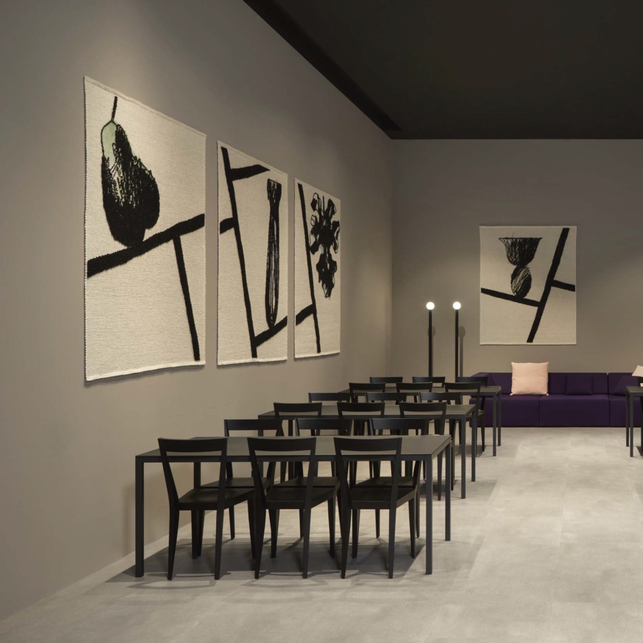 Ковер с абстрактным дизайном от Antonio Lupi отличается выразительным графическим изображением в виде стилизованной формы, напоминающей вазу или бокал. Чёрные линии образуют композицию с акцентом на центральный элемент, который дополнен жёлто-зелёными оттенками. Нейтральный бежевый фон подчёркивает контраст рисунка, сохраняя общий баланс.
