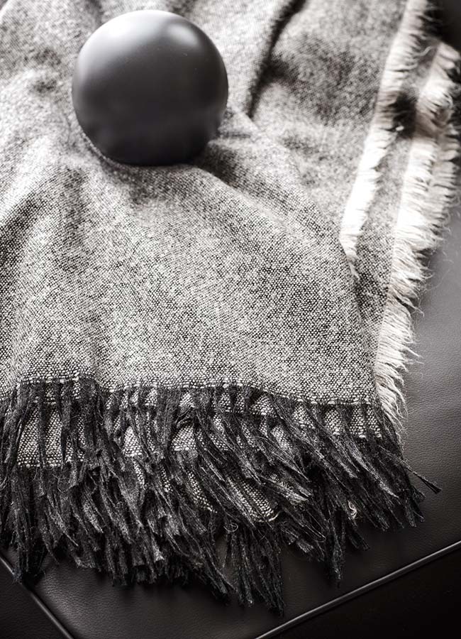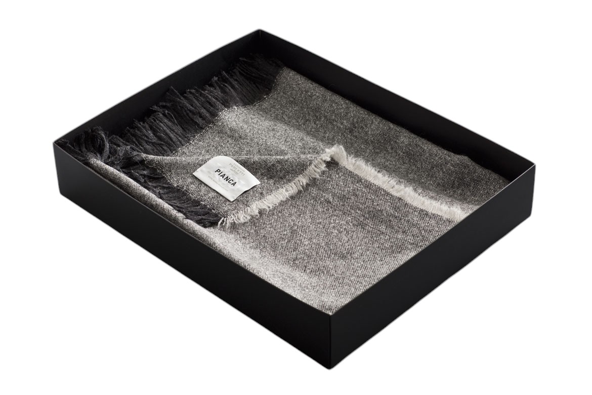 Плед Pianca Armonica выполнен из натуральной шерсти, что обеспечивает мягкость и тепло. Его двусторонний дизайн в серой гамме с плавным переходом оттенков делает модель универсальной для различных интерьеров. Края украшены декоративной бахромой.