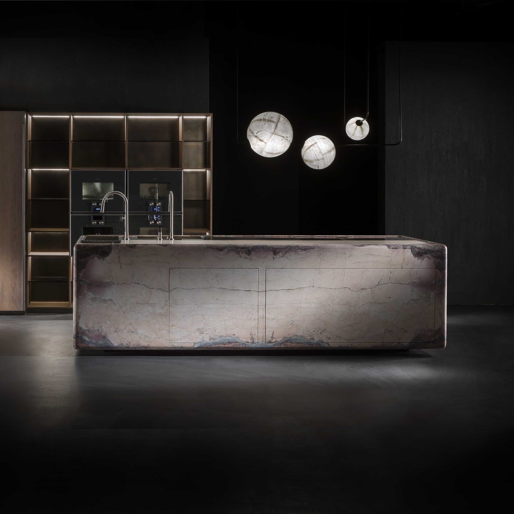 Кухонная мебель Henge Oneon от Massimo Castagna выполнена из натурального камня светло-бежевого оттенка с плавными переходами к розовато-коричневым прожилкам, что придает поверхности эффект мраморной текстуры. Прямые линии и минималистичный дизайн подчеркивают современный характер мебели. Основной элемент конструкции — массивная центральная столешница с просторными выдвижными ящиками, которые обеспечивают удобное хранение.