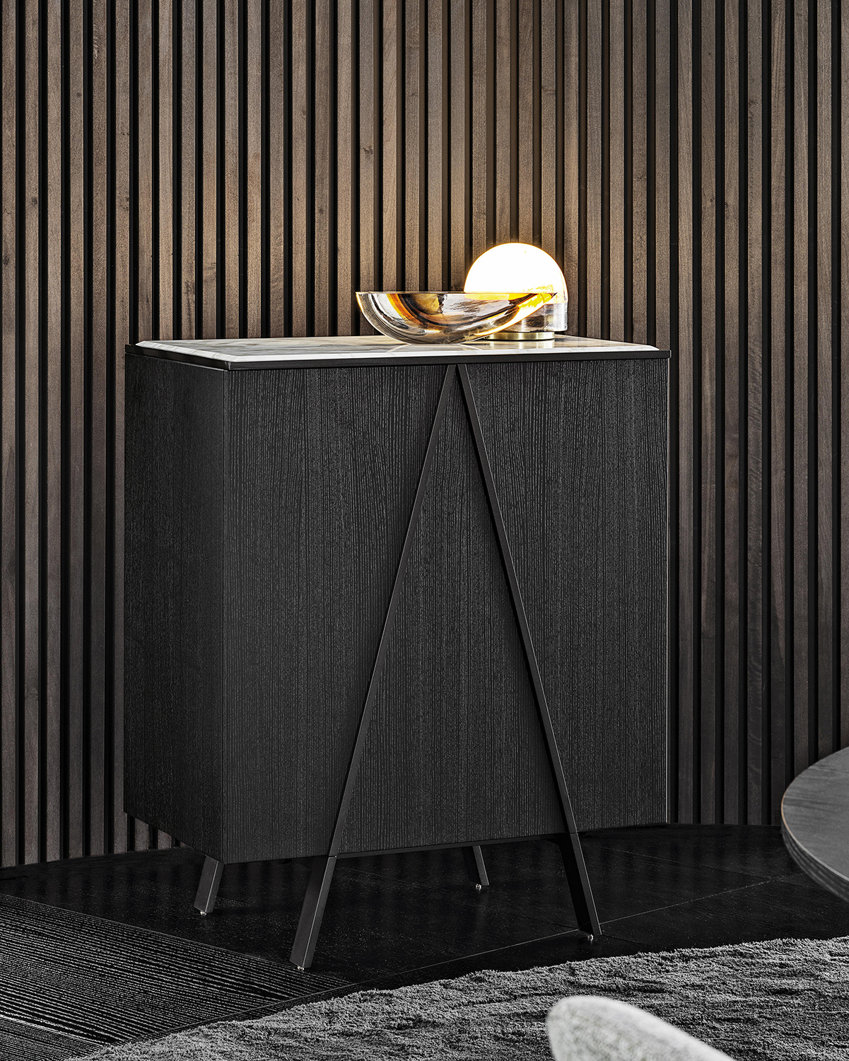 Бар Minotti Easel, спроектированный студией Nendo design, является отражением итальянской эстетики и инновационного дизайна. Сочетание столешницы из белого мрамора с фасадом коричневого оттенка создает игру контрастов, при этом сохраняя благородство и изысканность в каждой детали. Каркас из металла обеспечивает надежную поддержку и добавляет современный технологичный акцент. Такой бар идеально впишется в интерьер, где есть стремление к элегантности и функциональности. Он может служить центральным элементом в пространстве гостиной, домашней библиотеки или даже офиса. Материалы высшего качества не только гарантируют долговечность и устойчивость к ежедневной эксплуатации, но и облегчают уход за мебелью, сохраняя ее превосходный внешний вид на долгие годы.