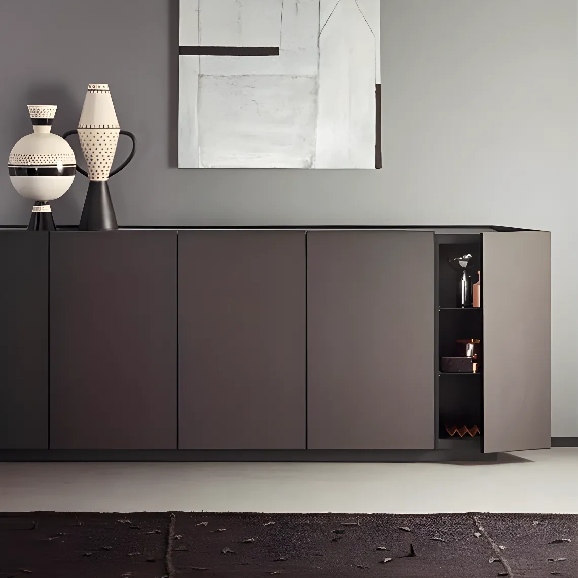 Этот бар идеально подойдёт для гостиной или кабинета, где он станет не только практичным местом для хранения, но и стильным акцентом. Сдержанный дизайн и нейтральный цвет позволяют бару легко сочетаться с различными элементами интерьера, создавая атмосферу уюта и гармонии.