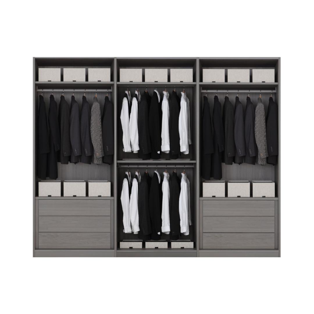 Открытую гардеробную систему Storage для итальянского бренда Porro спроектирован Пьеро Лиссони, чей стиль отличается утонченной простотой и шармом. Эта гардеробная из трех модулей с различным наполнением полностью выполнена из тонированной в пепельно-серый оттенок канадской тсуги – у нее красивая выраженная фактура. Металлические элементы окрашены в серый цвет.