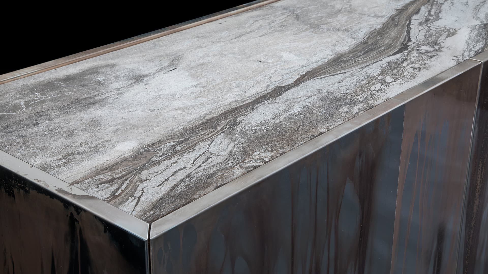 Комод Henge Side-X Evo от Massimo Castagna сочетает в себе строгость формы и природные материалы. Корпус выполнен из дерева, а фасад украшен панелями из металла с эффектом неоднородного, рельефного рисунка. Цветовая гамма фасада варьируется от серого до сине-зеленого с хаотичными размытыми разводами, создавая эффект природного ландшафта. Ножки комода выполнены из тёмного металла, что придаёт конструкции визуальную легкость.