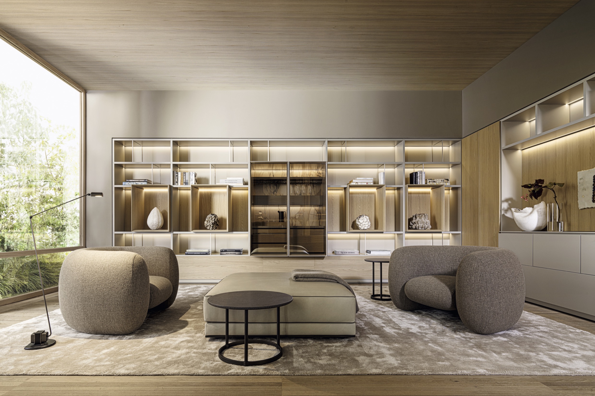 Стеллаж Molteni 505 UP System, разработанный дизайнером Nicola Gallizia, представляет собой модульное решение для хранения и демонстрации предметов. Центральный элемент с раздвижными стеклянными дверями подчеркивает современный стиль, а интегрированная подсветка выделяет детали интерьера. Элементы с отделкой под мрамор создают эффектный акцент, гармонируя с текстурой дерева. Полки разной высоты и закрытые секции обеспечивают гибкость в организации пространства.
