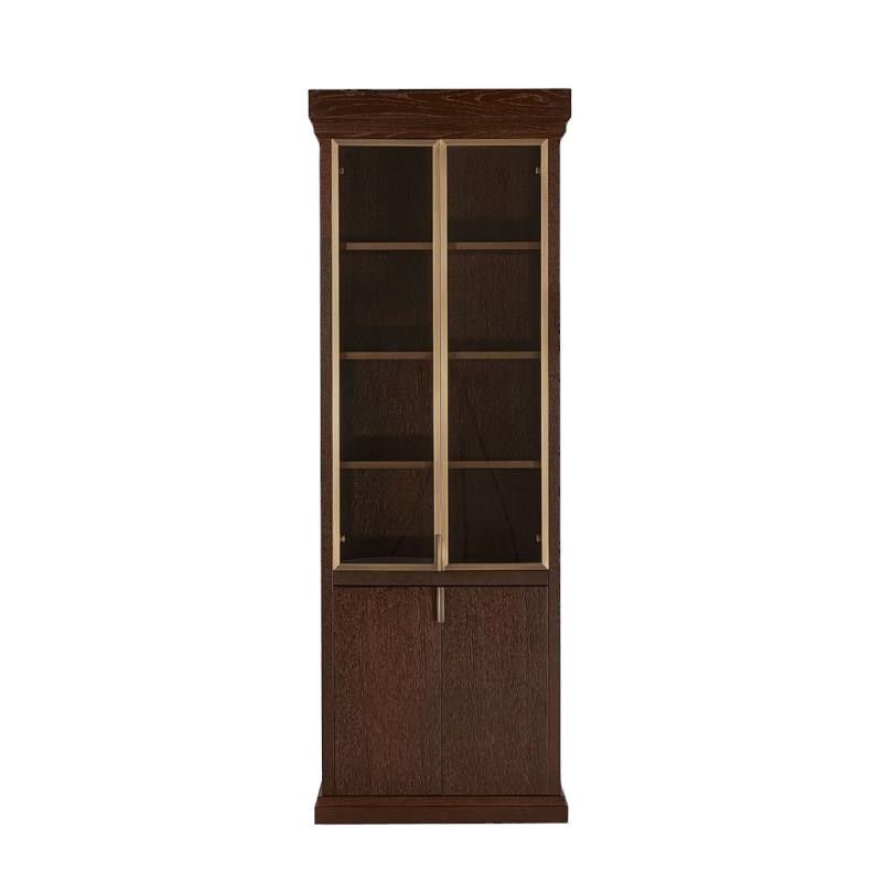 Витрина MEDICI выполнена из темного дерева и оснащена стеклянными дверцами, что позволяет удобно демонстрировать содержимое. Золотистые металлические элементы обрамления добавляют изысканности и благородства. Функциональная особенность данной витрины — выдвигаемая настольная поверхность, что делает её удобной для использования в качестве мини-бара или дополнительной рабочей зоны.