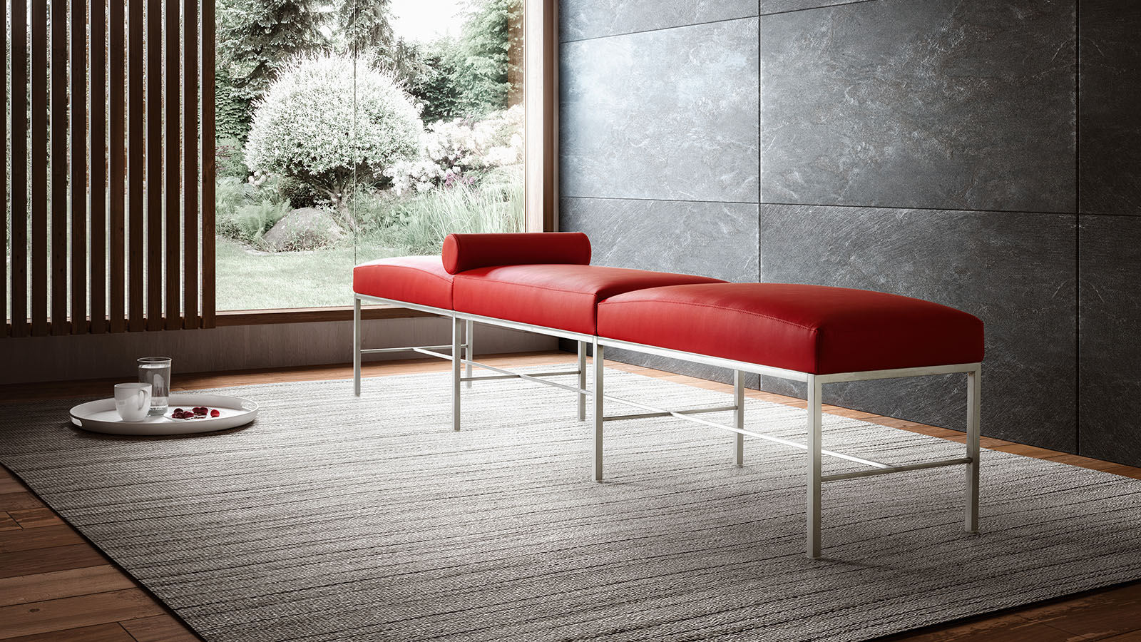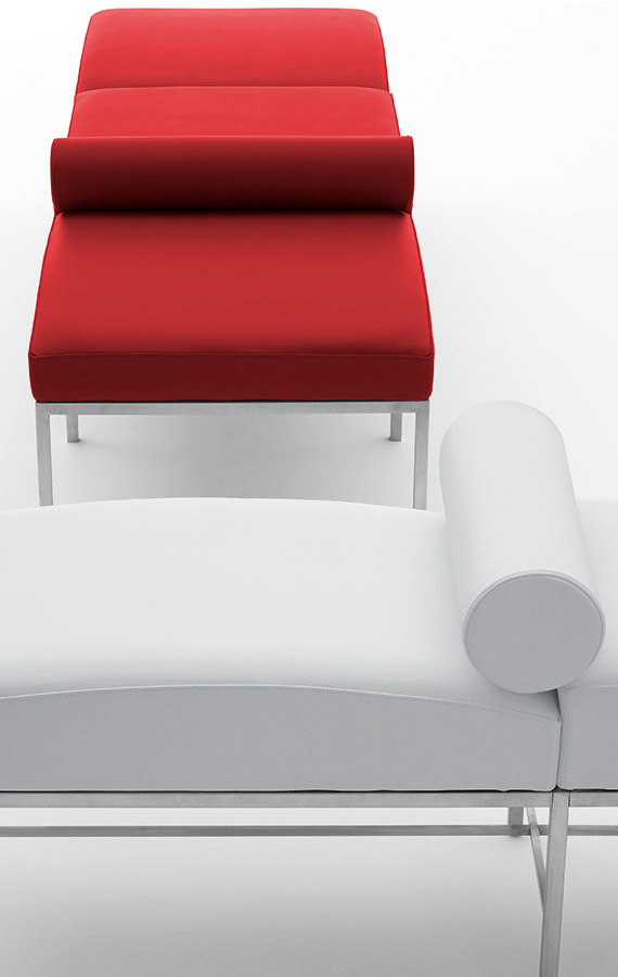 Кушетка подойдёт для интерьеров в стиле минимализм, модерн или хай-тек. Её можно использовать в просторных гостиных, зонах отдыха или общественных пространствах. Яркий красный цвет сиденья становится акцентом, который оживляет нейтральную обстановку, добавляя интерьеру энергичности и выразительности.