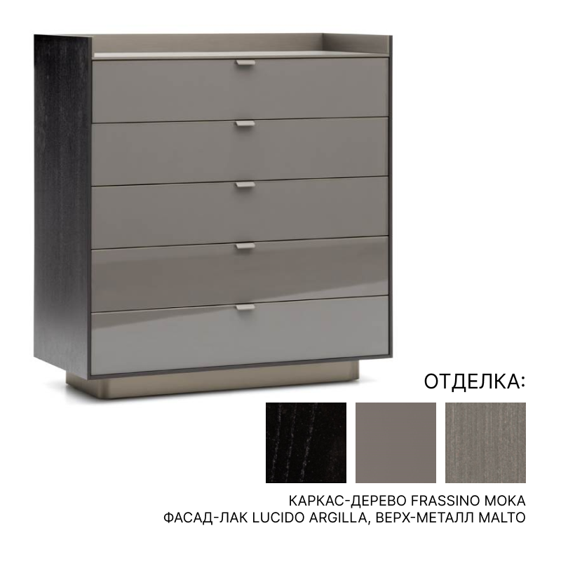 каркас-дерево Frassino Moka, фасад-лак Lucido Argilla, верх-металл Malto