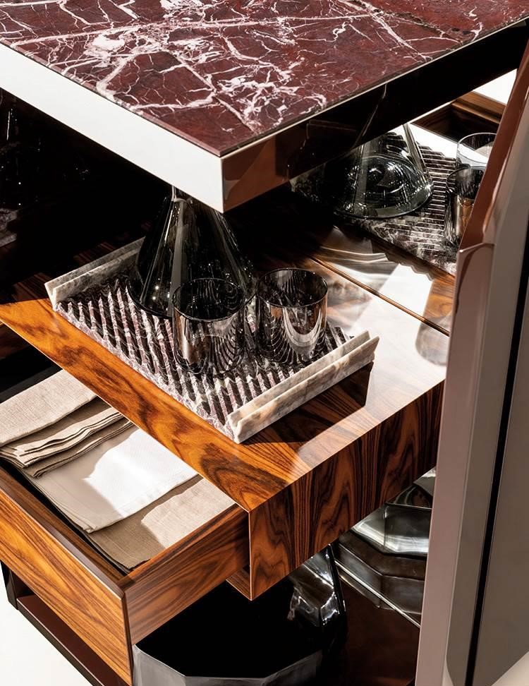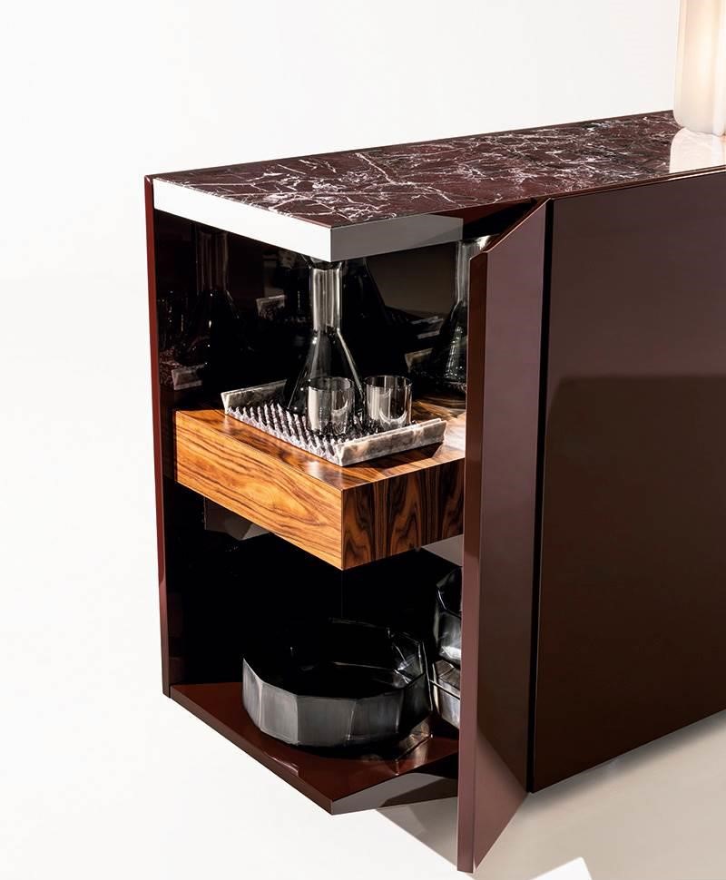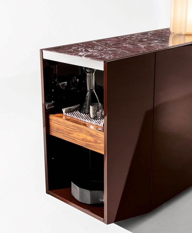 Комод, разработанный дизайнером Giampiero Tagliaferri, сочетает лаконичные линии и функциональность, подчеркивая изысканный подход к организации пространства. Визуально он выделяется насыщенным зелёным цветом с глубоким глянцевым покрытием, которое придаёт ему эффектный и современный вид. Верхняя панель выполнена из камня, добавляя элемент природной текстуры и гармонично сочетаясь с глянцевыми фасадами.