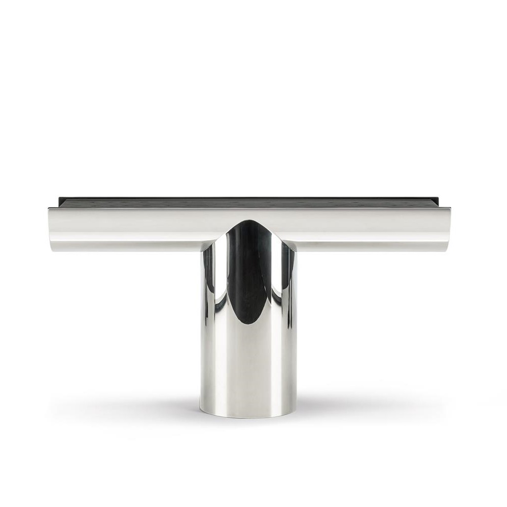 основание-Polished Stainless Steel, столешница-Licorice Lacquered Open-Pore Ash Veneer