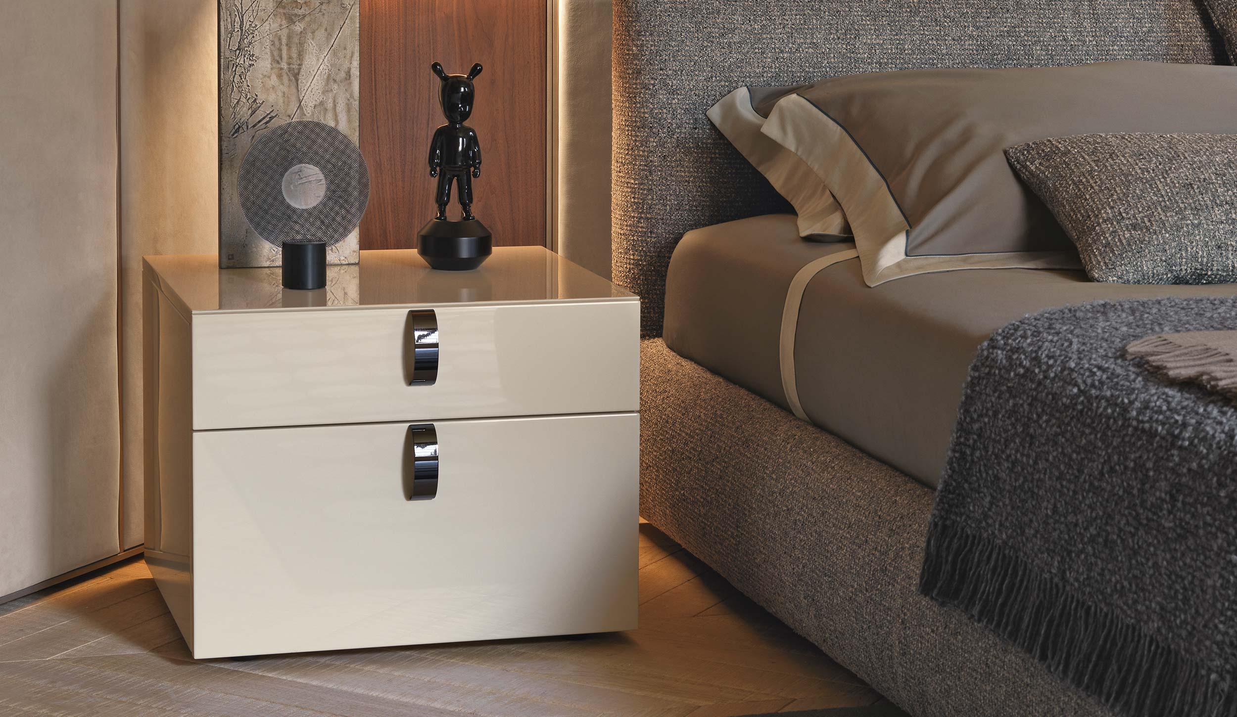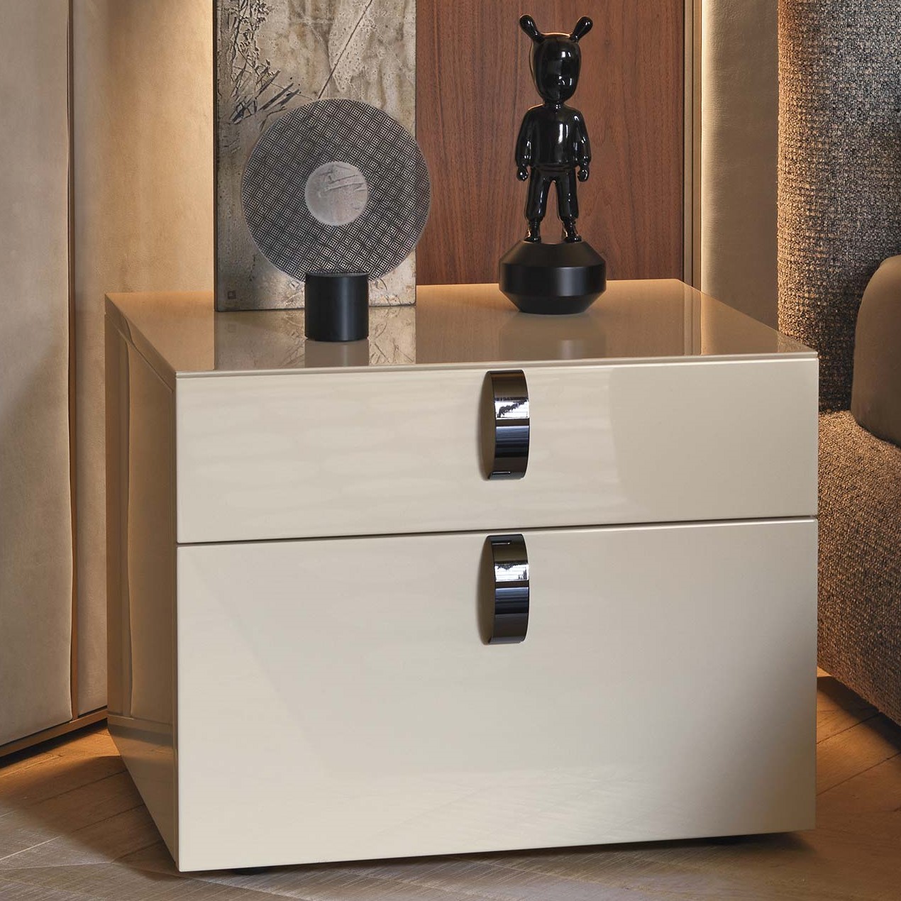 Прикроватная тумба Flou SPLENDOR, разработанная Rodolfo Dordoni, выполнена в лаконичном и элегантном дизайне. Корпус и фасад тумбы покрыты глянцевым лаком в приглушенном кремовом оттенке, который придает мебели утонченность. Два вместительных ящика с декоративными ручками из черного никеля добавляют контраста и подчеркивают стильный вид.