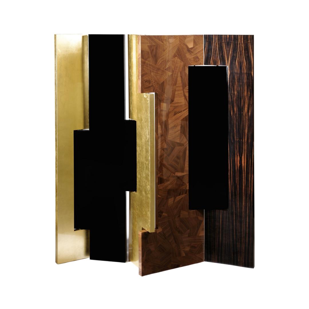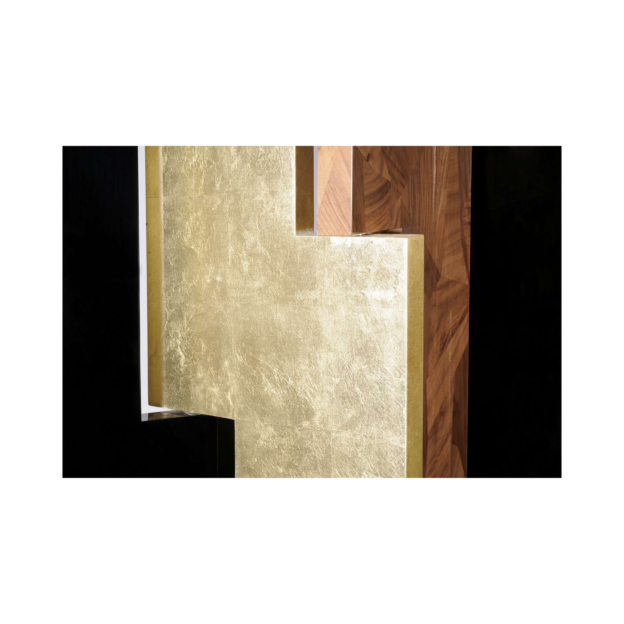 golden leaf, black lacquered wood, walnut wood, ebony leaf