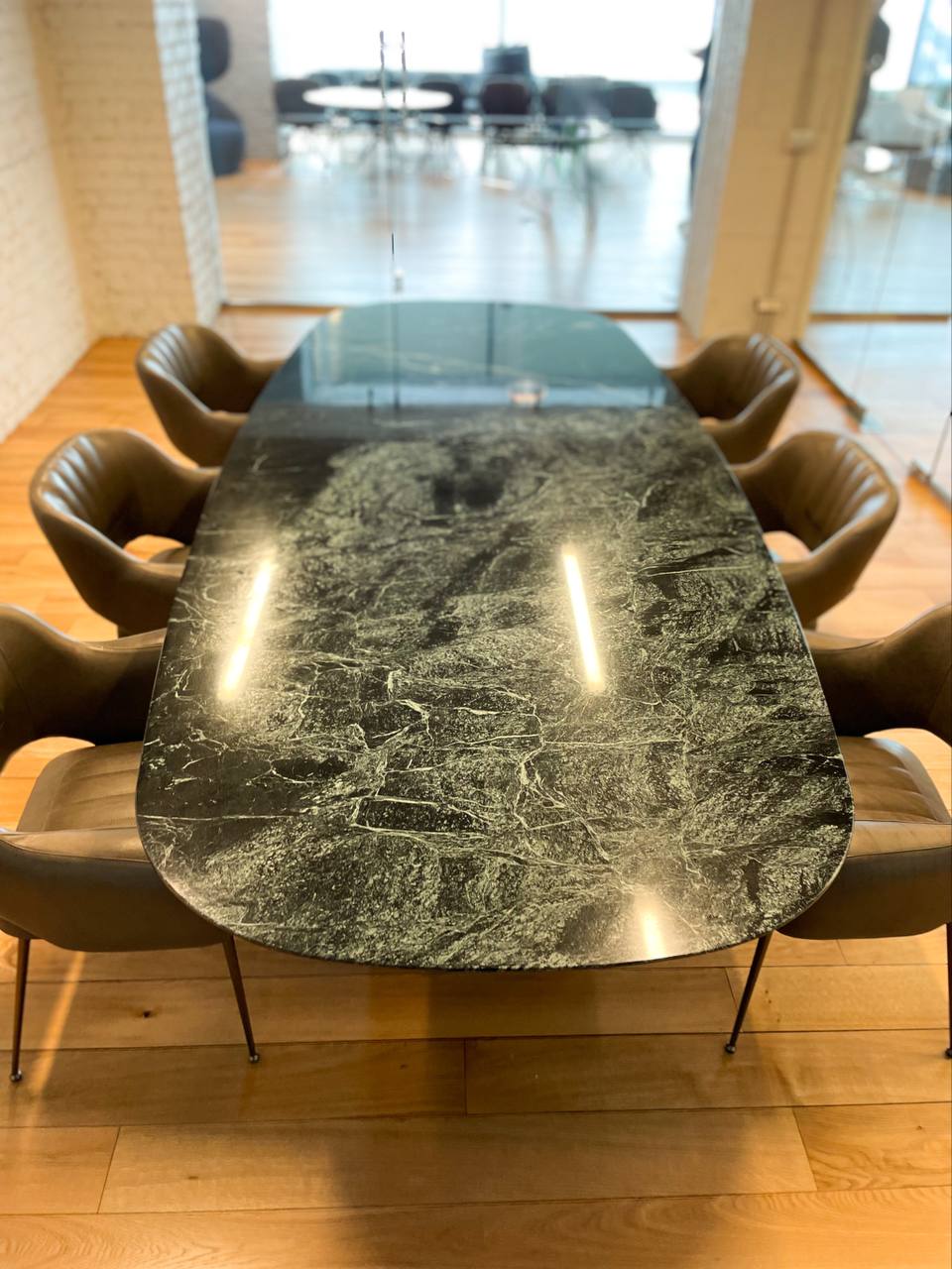 топ мрамор Verde Alpi, база solid milled wood in the finish “Ebano Capri” and black chromed metal details
