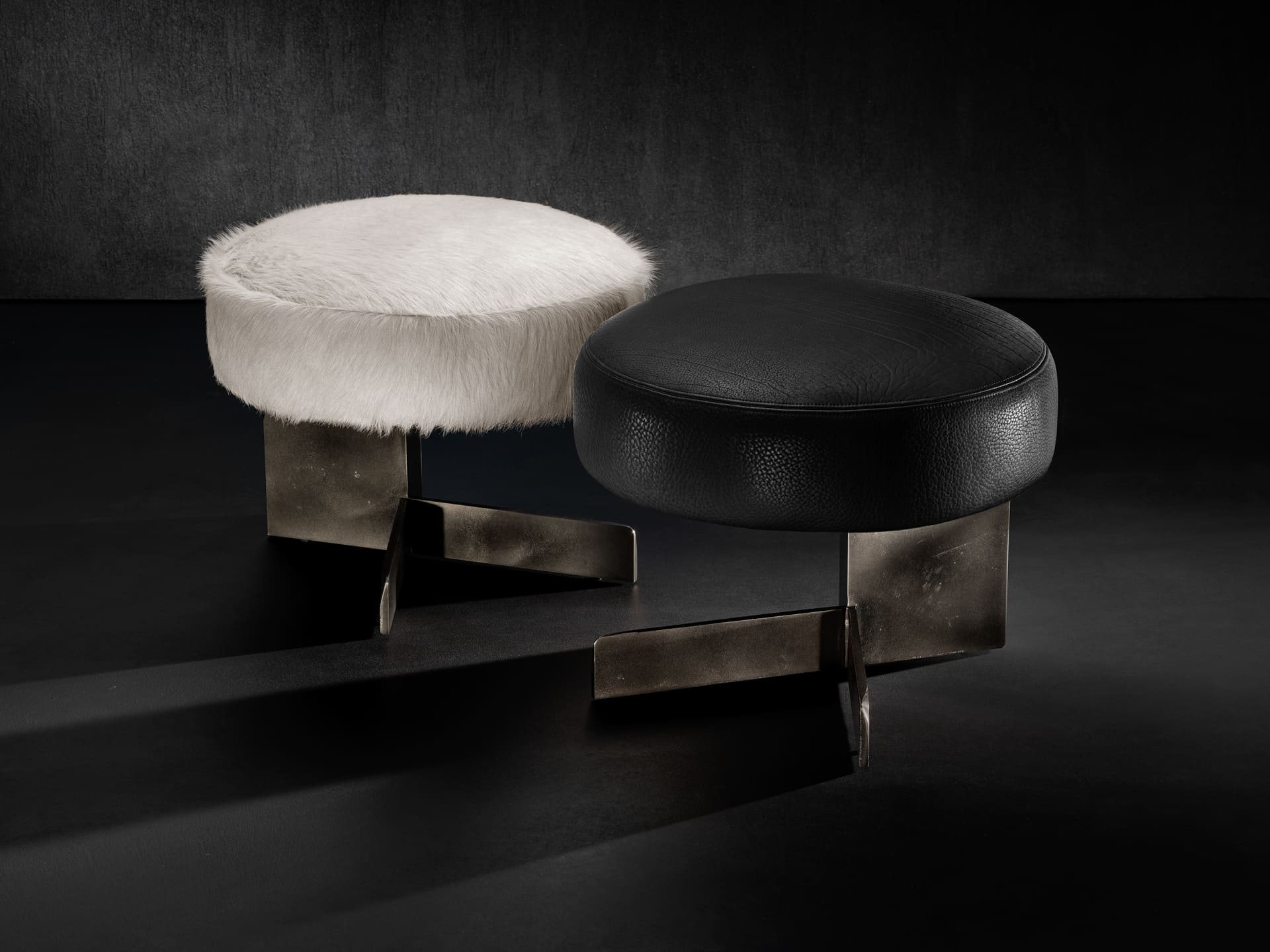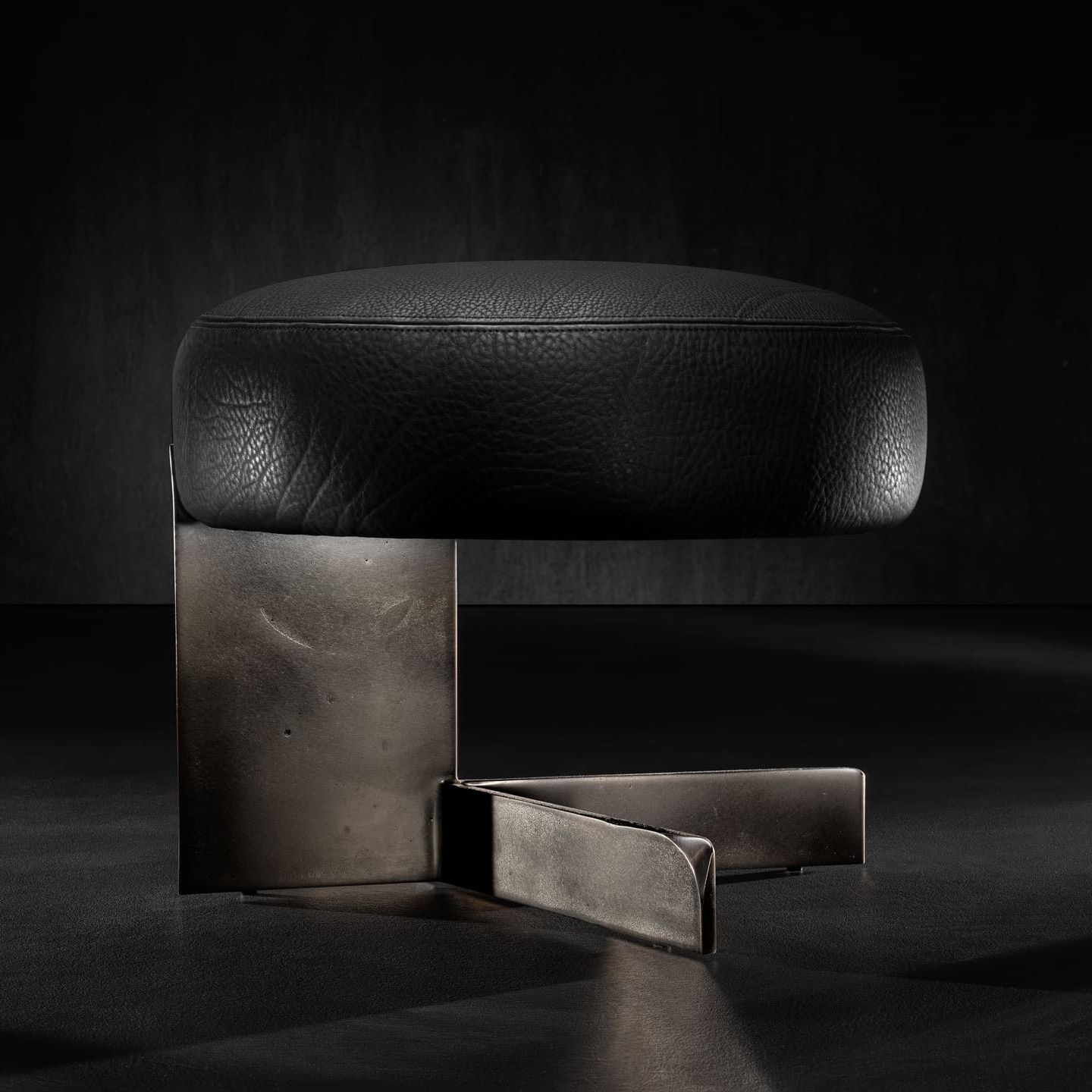 Пуф Henge Tambourine от дизайнера Ugo Cacciatori выполнен в индустриальном стиле с использованием контрастных материалов. Верхняя часть пуфа обтянута черной кожей с текстурой, а основа изготовлена из грубого металла с матовым покрытием. Геометрическая форма основания подчеркивает минималистичный и скульптурный дизайн, создавая интересный визуальный акцент.