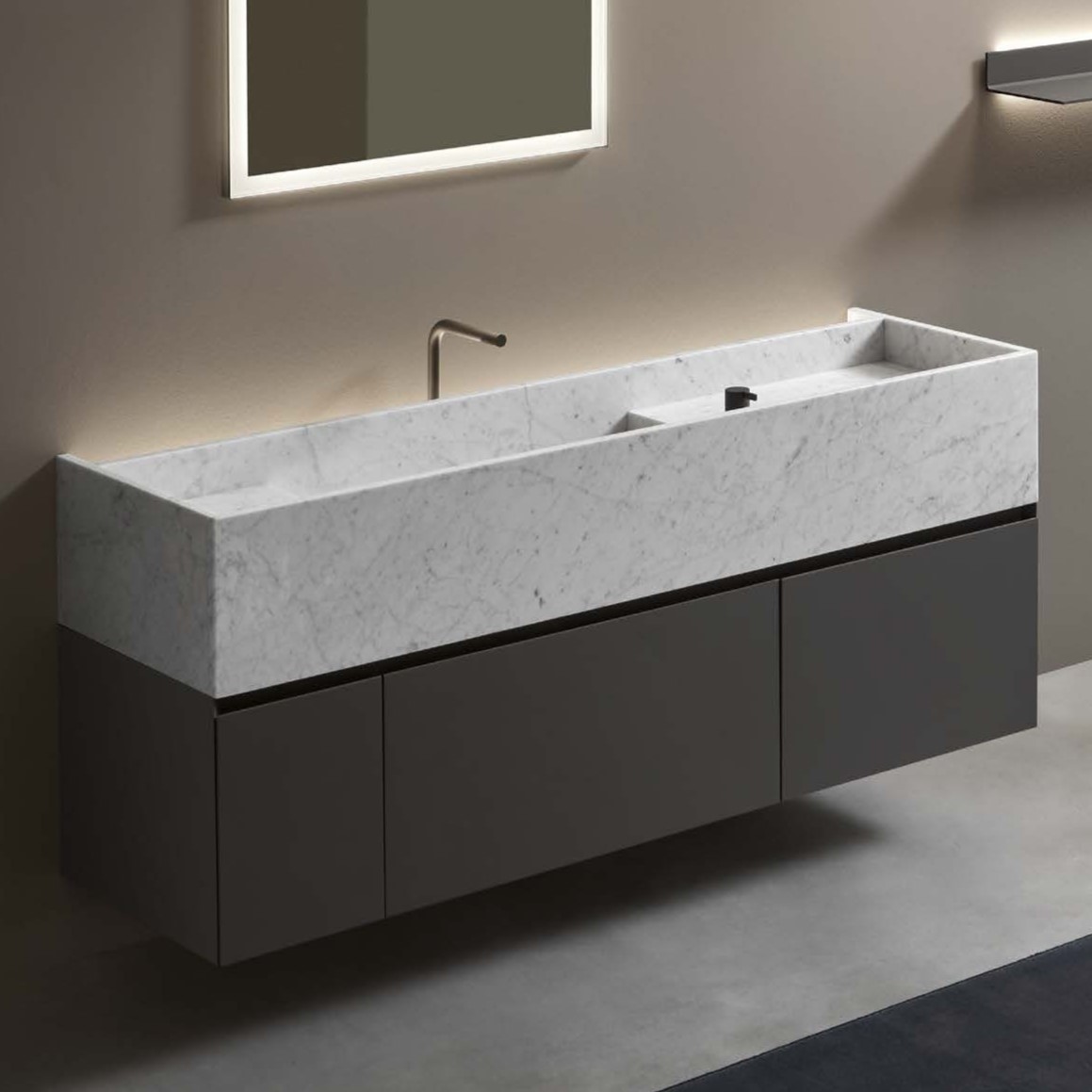 тумба и полка-SMOKE SETA, столешница с раковиной-мрамор BIANCO CARRARA, органайзеры-стекло FUME, вкладыши-NOCE CANALETTO, смеситель-SMOKE OPACO, сифон-черный матовый